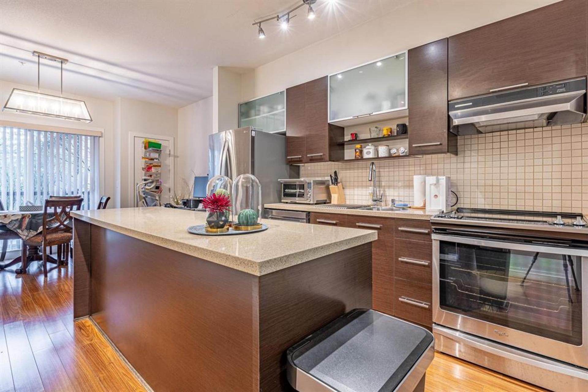 This private, quiet & bright 2-bedroom, 2 full bathrooms with high-end finishes throughout. Newer carpets on stairs & bedrooms, newer laminate flooring in open-concept living room, kitchen and dinning. Living room has high ceiling 10’2’’, Gourmet kitchen and dining area has high ceiling at 9’ – great for entertaining, equipped with stainless steel appliances, Corian countertops, a centre island and dark cabinetry. Enjoy great family time on the south-facing balcony, stunning fireplace, or on the tranquil garden patio. Vaulted ceilings in primary bedroom with 4 piece ensuite & laundry on the top floor. Extra large 2 car garage with bonus storage. Close to shopping, transit, biking, trails, playground, golf and top-ranking Windsor Secondary school!